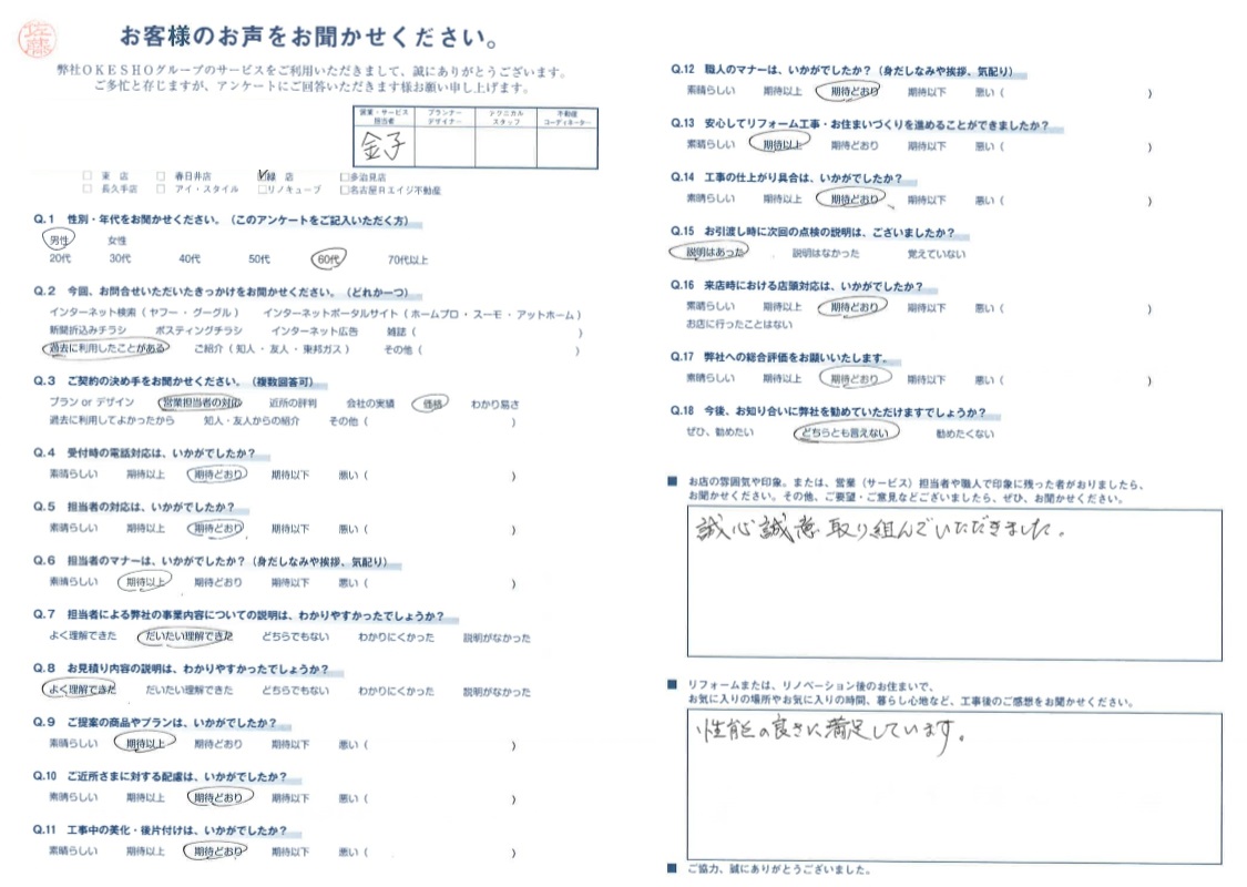 お店の雰囲気や印象。または、営業(サービス)担当者や職人で印象に残った者がおりましたら、お聞かせください。その他、ご要望・ご意見などございましたら、ぜひ、お聞かせください。