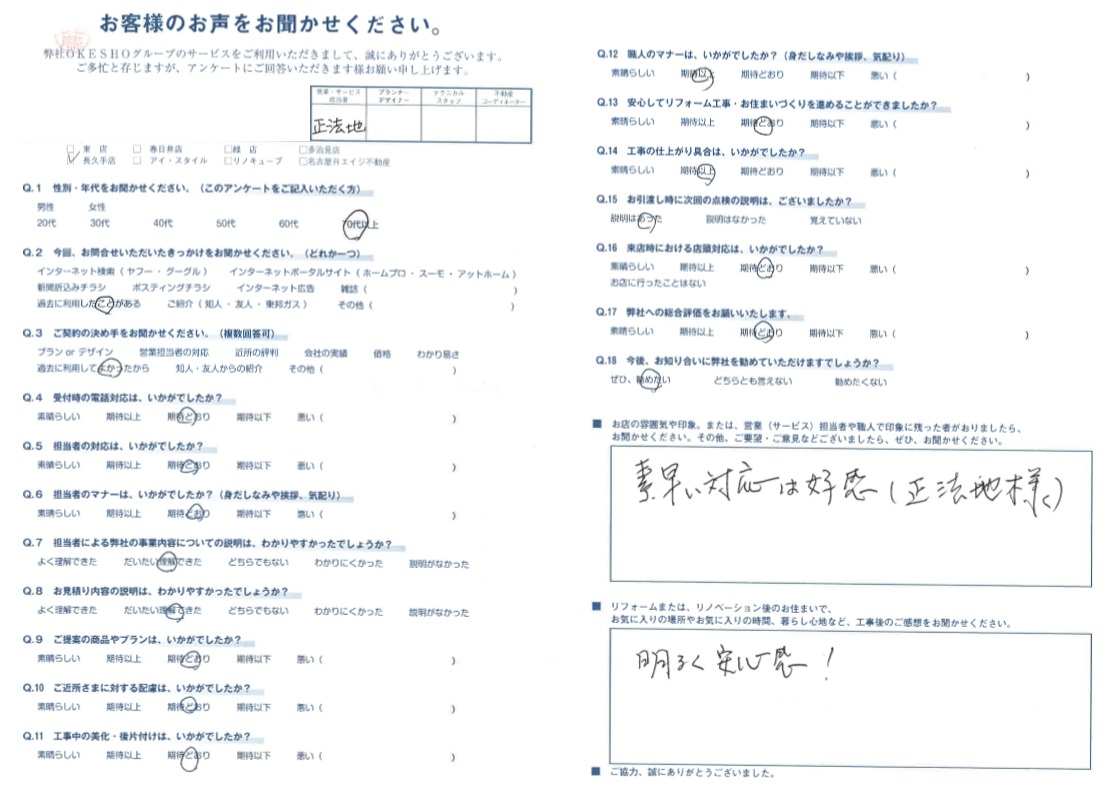 お店の雰囲気や印象。または、営業(サービス)担当者や職人で印象に残った者がおりましたら、お聞かせください。その他、ご要望・ご意見などございましたら、ぜひ、お聞かせください。