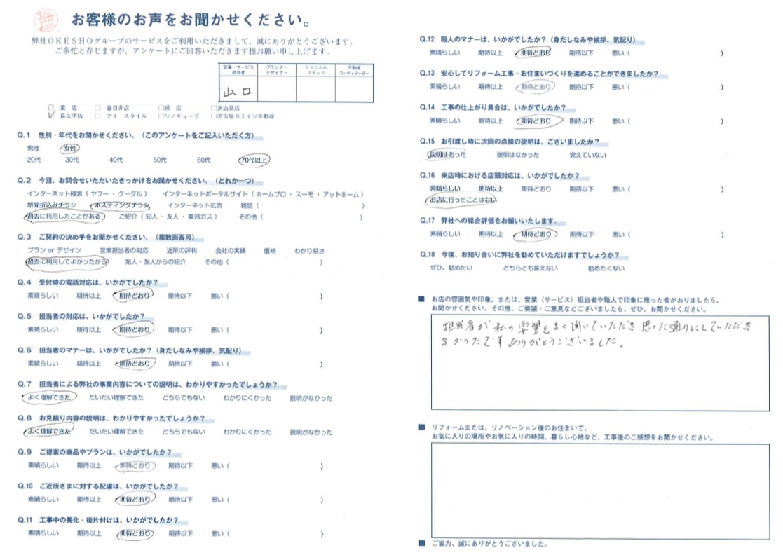 担当者が私の要望をよく聞いていただき 思った通りにしていただきよかったです。ありがとうございました。