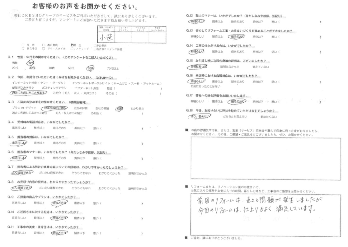 前回のリフォームは 色々と問題が発生しましたが、今回のリフォームは 仕上りもよく 満足しています。