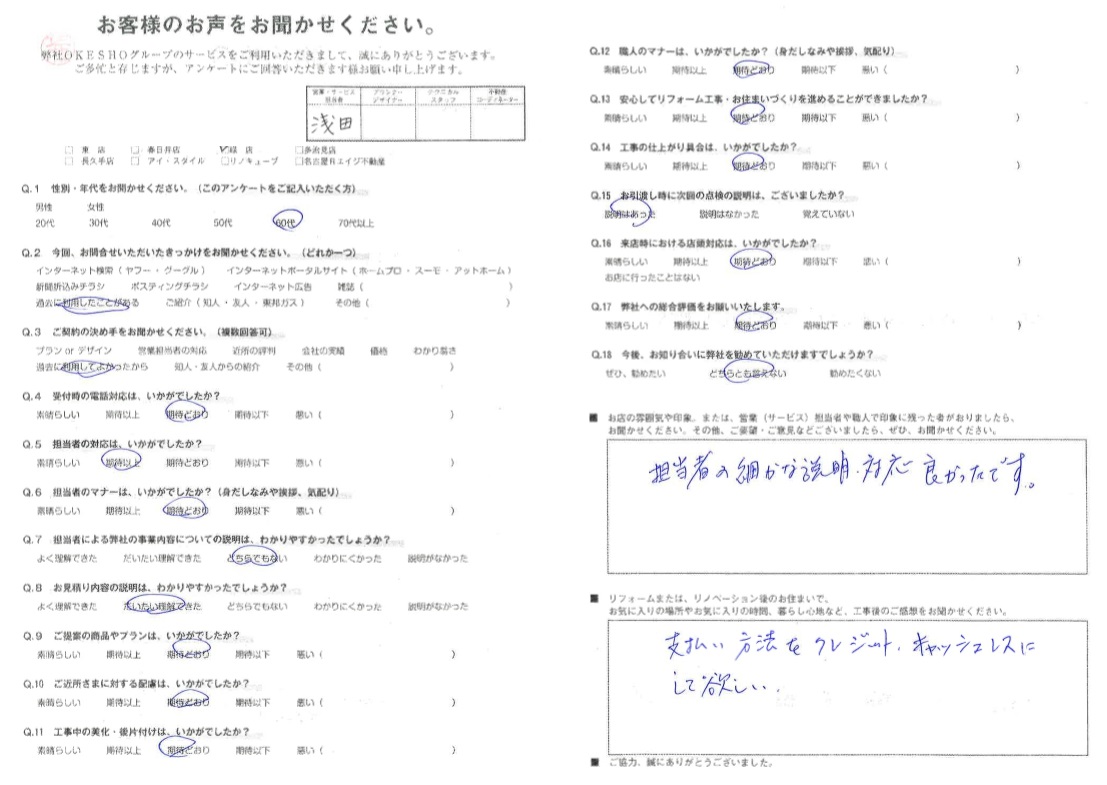 お店の雰囲気や印象。または、営業(サービス)担当者や職人で印象に残った者がおりましたら、お聞かせください。その他、ご要望・ご意見などございましたら、ぜひ、お聞かせください。