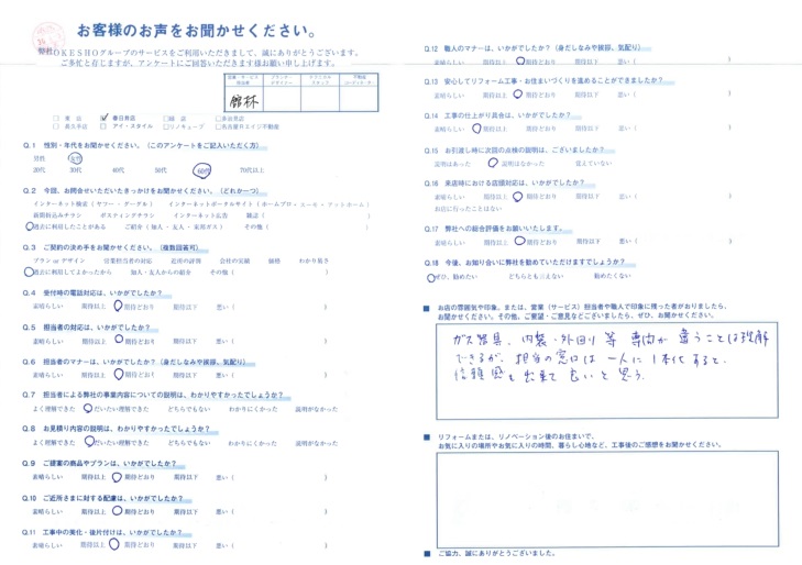 ガス器具、内装、外回り等 専門が違うことは理解できるが、担当の窓口は一人に1本化すると信頼感も来て良いと思う。