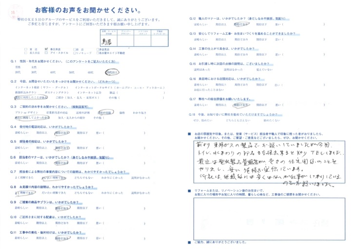 お店の雰囲気や印象。または、営業(サービス)担当者や職人で印象に残った者がおりましたら、お聞かせください。その他、ご要望・ご意見などございましたら、ぜひ、お聞かせください。