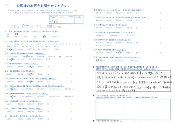お店の雰囲気や印象。または、営業(サービス)担当者や職人で印象に残った者がおりましたら、お聞かせください。その他、ご要望・ご意見などございましたら、ぜひ、お聞かせください。