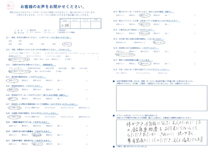 体が少々不自由になった主人のために1Fの食品庫兼物置をお風呂にリフォームしていただきましたが、きれいに使いやすく希望通りにしていただき主人も満足しています。
