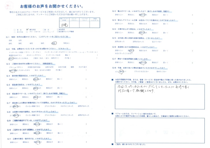 お店の雰囲気や印象。または、営業(サービス)担当者や職人で印象に残った者がおりましたら、お聞かせください。その他、ご要望・ご意見などございましたら、ぜひ、お聞かせください。