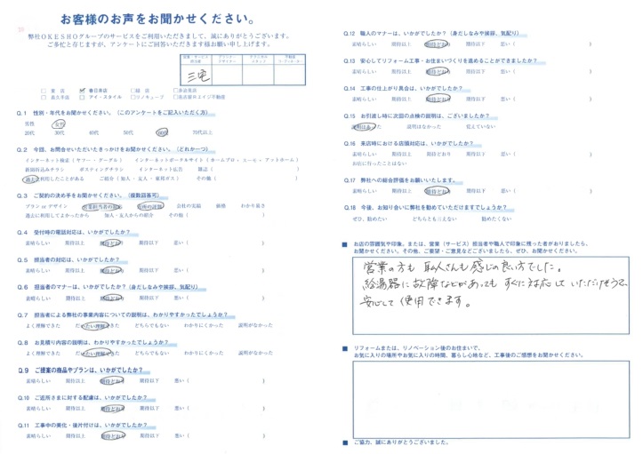 営業の方も職人さんも感じの良い方でした。給湯器に故障などがあっても すぐに対応していただけそうで安心して使用できます。