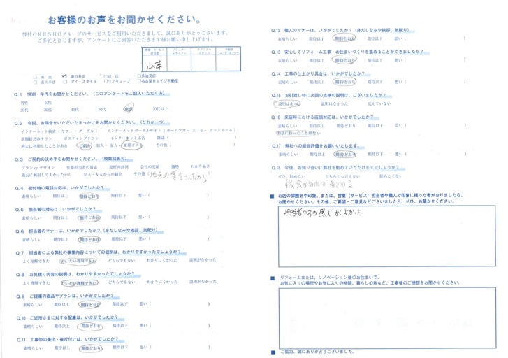お店の雰囲気や印象。または、営業(サービス)担当者や職人で印象に残った者がおりましたら、お聞かせください。その他、ご要望・ご意見などございましたら、ぜひ、お聞かせください。