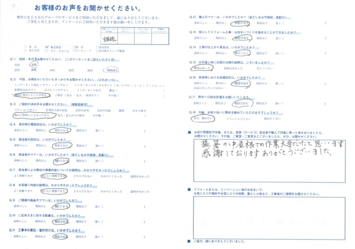 お店の雰囲気や印象。または、営業(サービス)担当者や職人で印象に残った者がおりましたら、お聞かせください。その他、ご要望・ご意見などございましたら、ぜひ、お聞かせください。