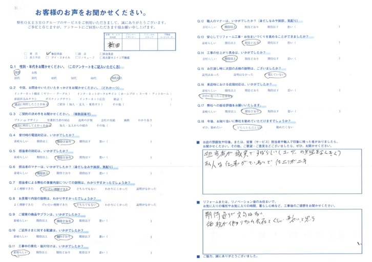 お店の雰囲気や印象。または、営業(サービス)担当者や職人で印象に残った者がおりましたら、お聞かせください。その他、ご要望・ご意見などございましたら、ぜひ、お聞かせください。