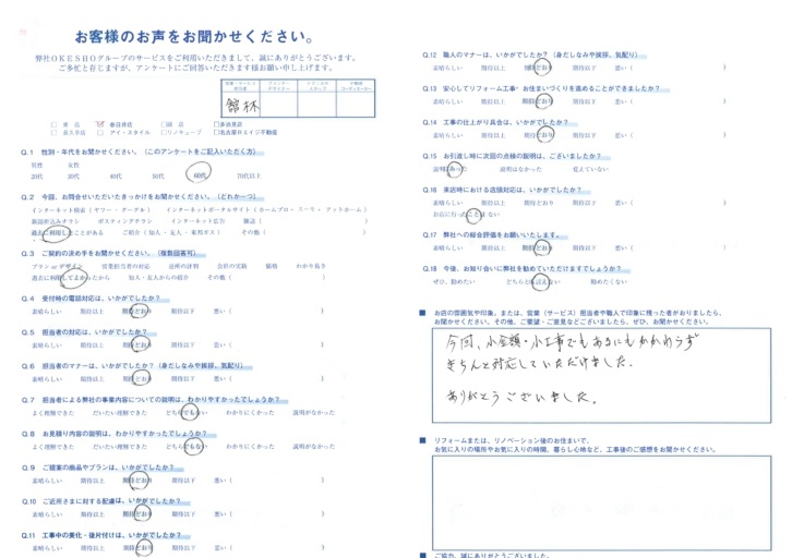 お店の雰囲気や印象。または、営業(サービス)担当者や職人で印象に残った者がおりましたら、お聞かせください。その他、ご要望・ご意見などございましたら、ぜひ、お聞かせください。