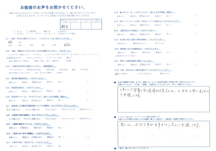 お店の雰囲気や印象。または、営業(サービス)担当者や職人で印象に残った者がおりましたら、お聞かせください。その他、ご要望・ご意見などございましたら、ぜひ、お聞かせください。