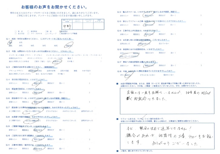 お店の雰囲気や印象。または、営業(サービス)担当者や職人で印象に残った者がおりましたら、お聞かせください。その他、ご要望・ご意見などございましたら、ぜひ、お聞かせください。