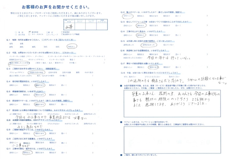 営業の山本さん、技術の方、お二人とも今回の工事以外の事でも親切に相談にのって下さり、とても助かりました。感謝してます。ありがとうございました。