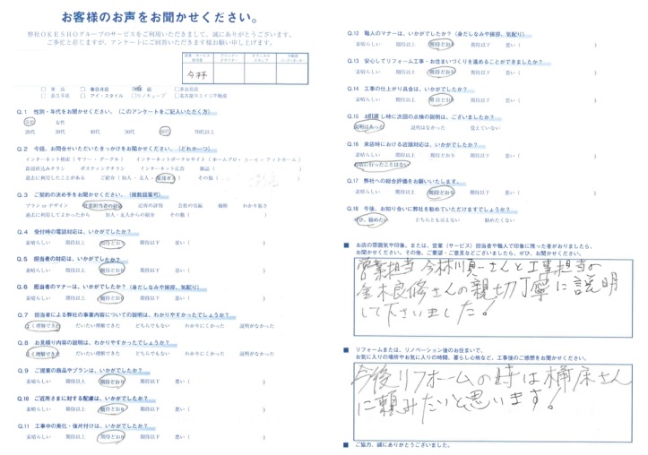 お店の雰囲気や印象。または、営業(サービス)担当者や職人で印象に残った者がおりましたら、お聞かせください。その他、ご要望・ご意見などございましたら、ぜひ、お聞かせください。