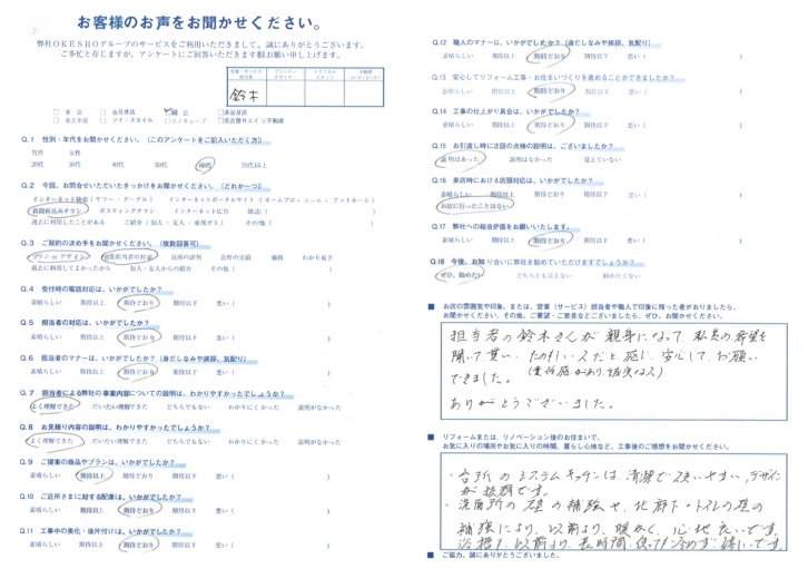 担当者の鈴木さんが 親身になって私共の希望を聞いて貰い、たのもしい人(責任感があり、誠実な人)だと感じ 安心してお願いできました。