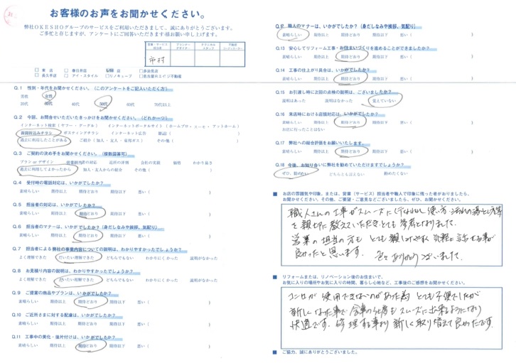 職人さんの工事がスムーズに行なわれ 使い方・汚れの落とし方等を親切に教えていただき、とても参考となりました。営業の担当の方も とても親しみやすく 気軽に話せる事が良かったと思います。色々ありがとうございました。