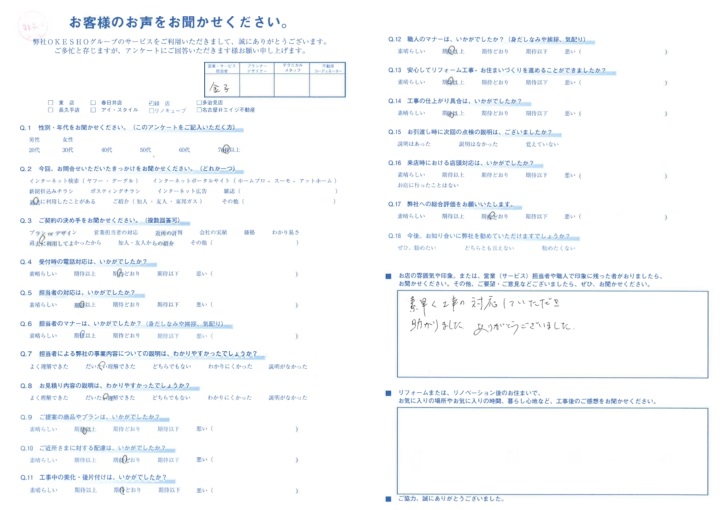 お店の雰囲気や印象。または、営業(サービス)担当者や職人で印象に残った者がおりましたら、お聞かせください。その他、ご要望・ご意見などございましたら、ぜひ、お聞かせください。