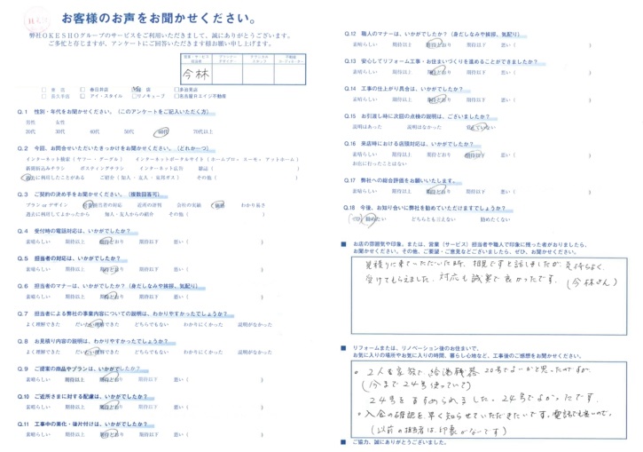 見積りに来ていただいた時、相見積ですと話しましたが、気持ちよく受けてもらえました。対応も誠実で良かったです。(今林さん)