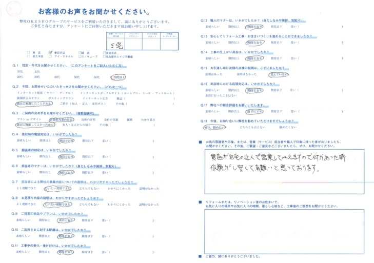 貴店が自宅の近くで営業してみえますので 何かあった時 依頼がしやすくて有難いと思っております。