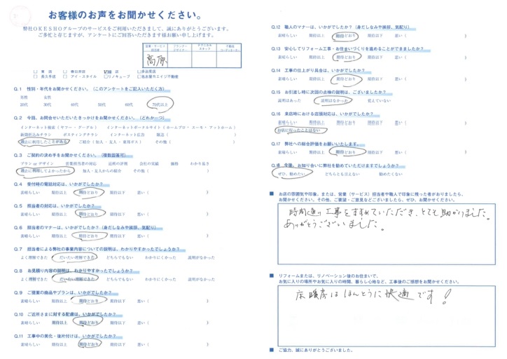 時間通り工事をすすめていただき、とても助かりました。ありがとうございました。