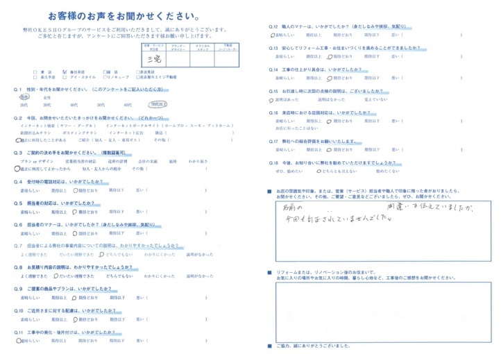 お店の雰囲気や印象。または、営業(サービス)担当者や職人で印象に残った者がおりましたら、お聞かせください。その他、ご要望・ご意見などございましたら、ぜひ、お聞かせください。