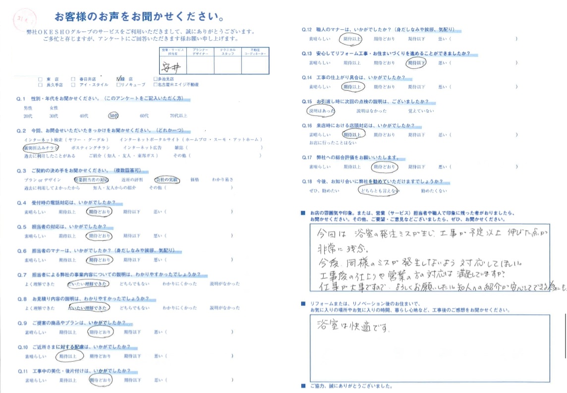 今回は 浴室の発注ミスが生じ、工事が予定以上伸びた点が非常に残念。