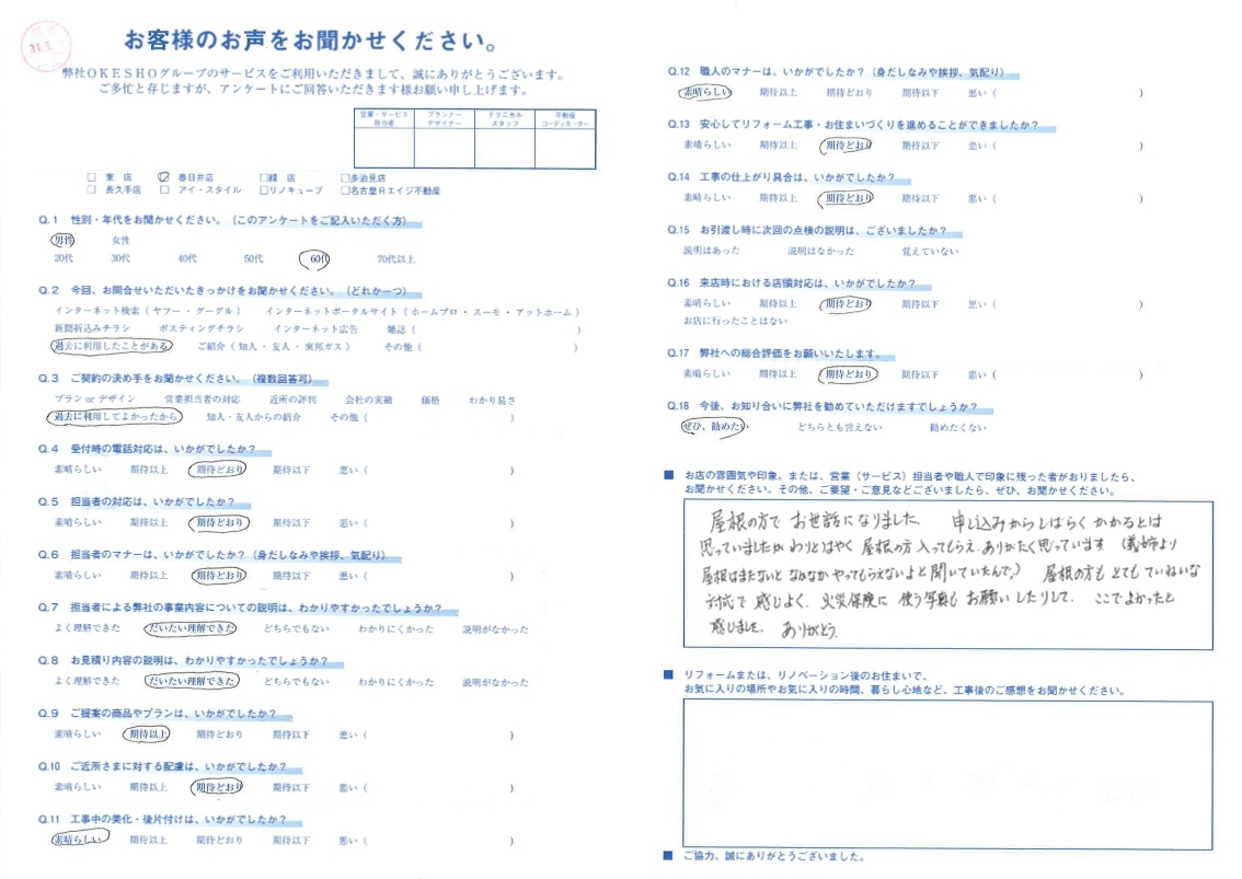 屋根の方でお世話になりました。申し込みから しばらくかかるとは思っていましたが わりとはやく屋根の方に入ってもらえ、ありがたく思っています。(義姉より屋根はまたないと なかなかやってもらえないよ と聞いていたんで。)屋根の方も とてもていねいな対応で感じよく、火災保険に使う写真もお願いしたりして ここでよかったと感じました。ありがとう。
