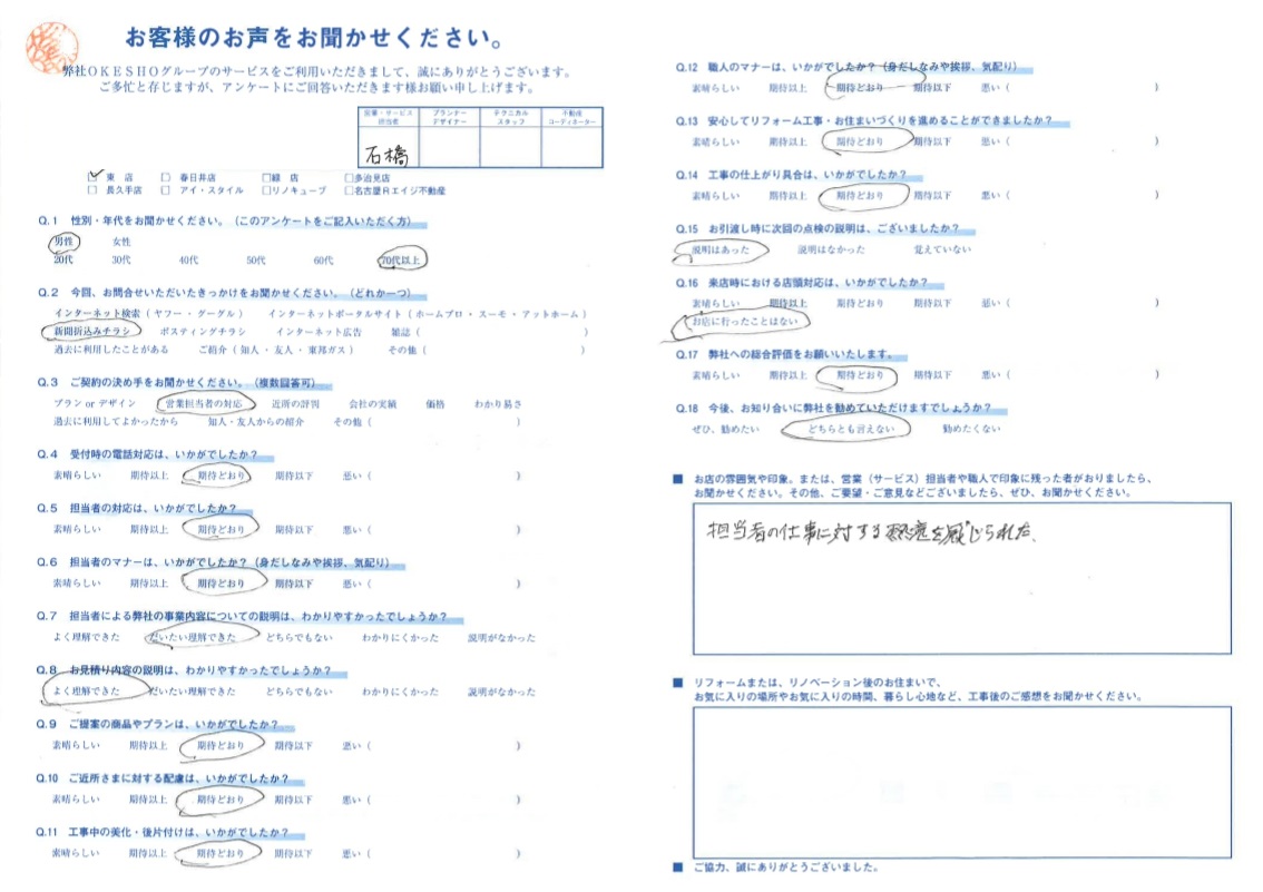 お店の雰囲気や印象。または、営業(サービス)担当者や職人で印象に残った者がおりましたら、お聞かせください。その他、ご要望・ご意見などございましたら、ぜひ、お聞かせください。