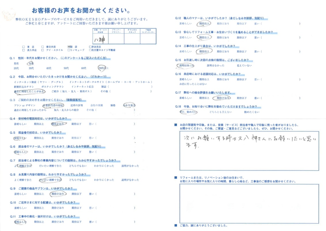 お店の雰囲気や印象。または、営業(サービス)担当者や職人で印象に残った者がおりましたら、お聞かせください。その他、ご要望・ご意見などございましたら、ぜひ、お聞かせください。