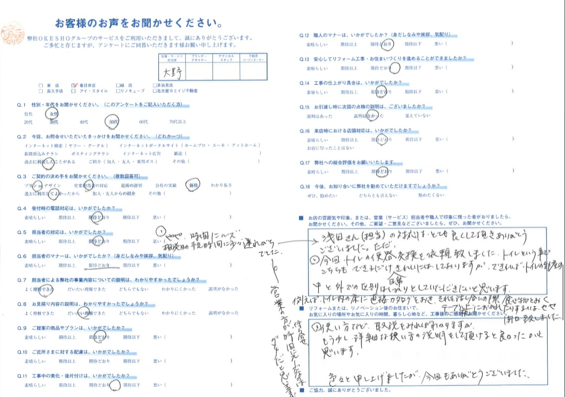 お店の雰囲気や印象。または、営業(サービス)担当者や職人で印象に残った者がおりましたら、お聞かせください。その他、ご要望・ご意見などございましたら、ぜひ、お聞かせください。