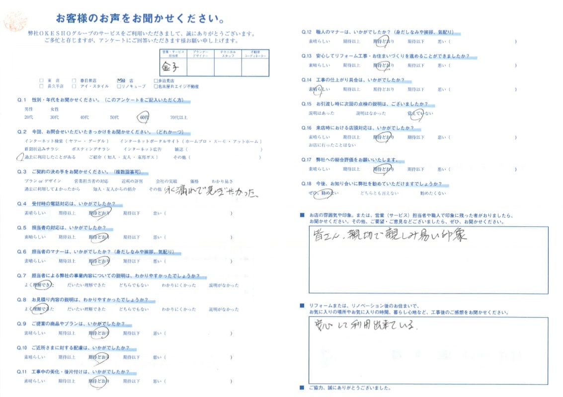 お店の雰囲気や印象。または、営業(サービス)担当者や職人で印象に残った者がおりましたら、お聞かせください。その他、ご要望・ご意見などございましたら、ぜひ、お聞かせください。