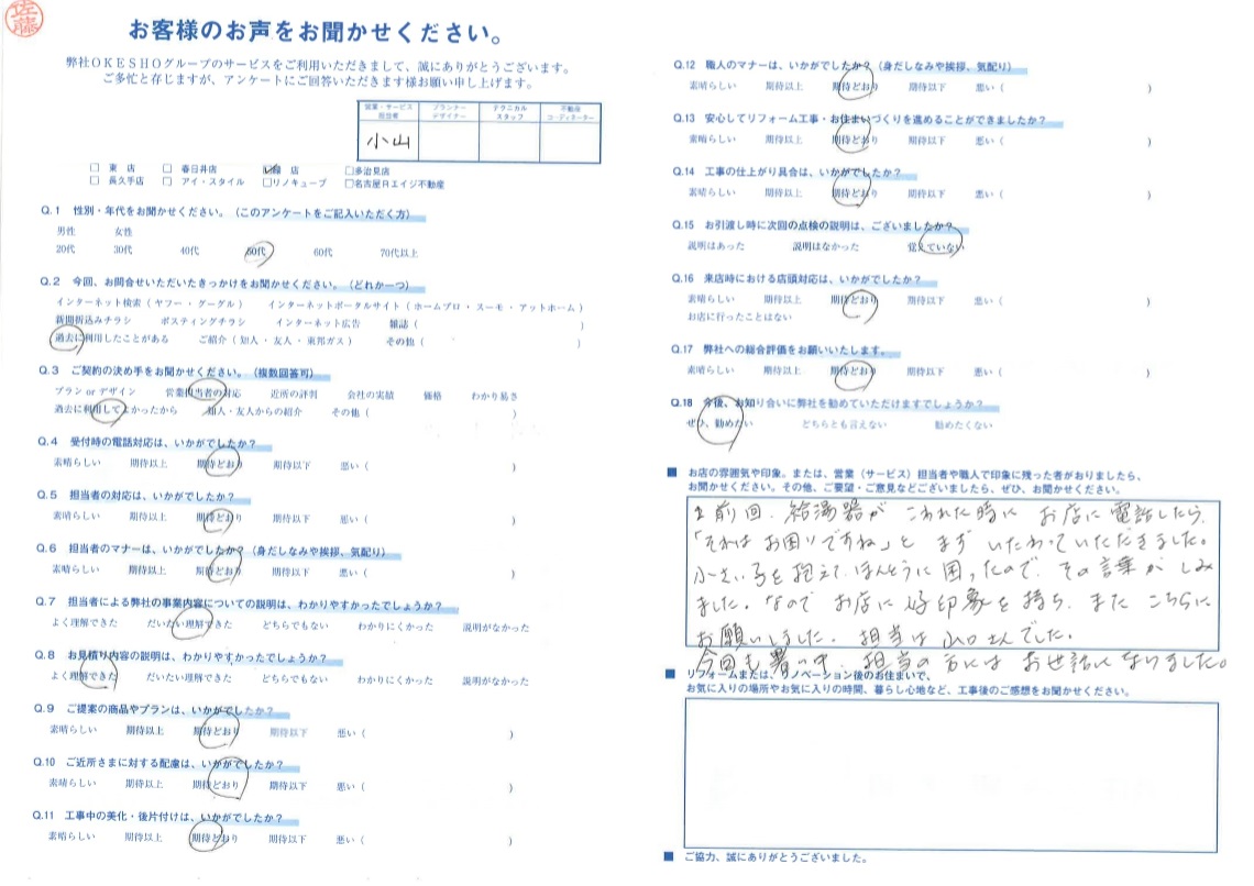 前回、給湯器がこわれた時に お店に電話をしたら「それはお困りですね」と まず いたわっていただきました。小さい子を抱えて ほんとうに困ったので その言葉がしみました。なのでお店に好印象を持ち、また こちらにお願いしました。担当は山口さんでした。