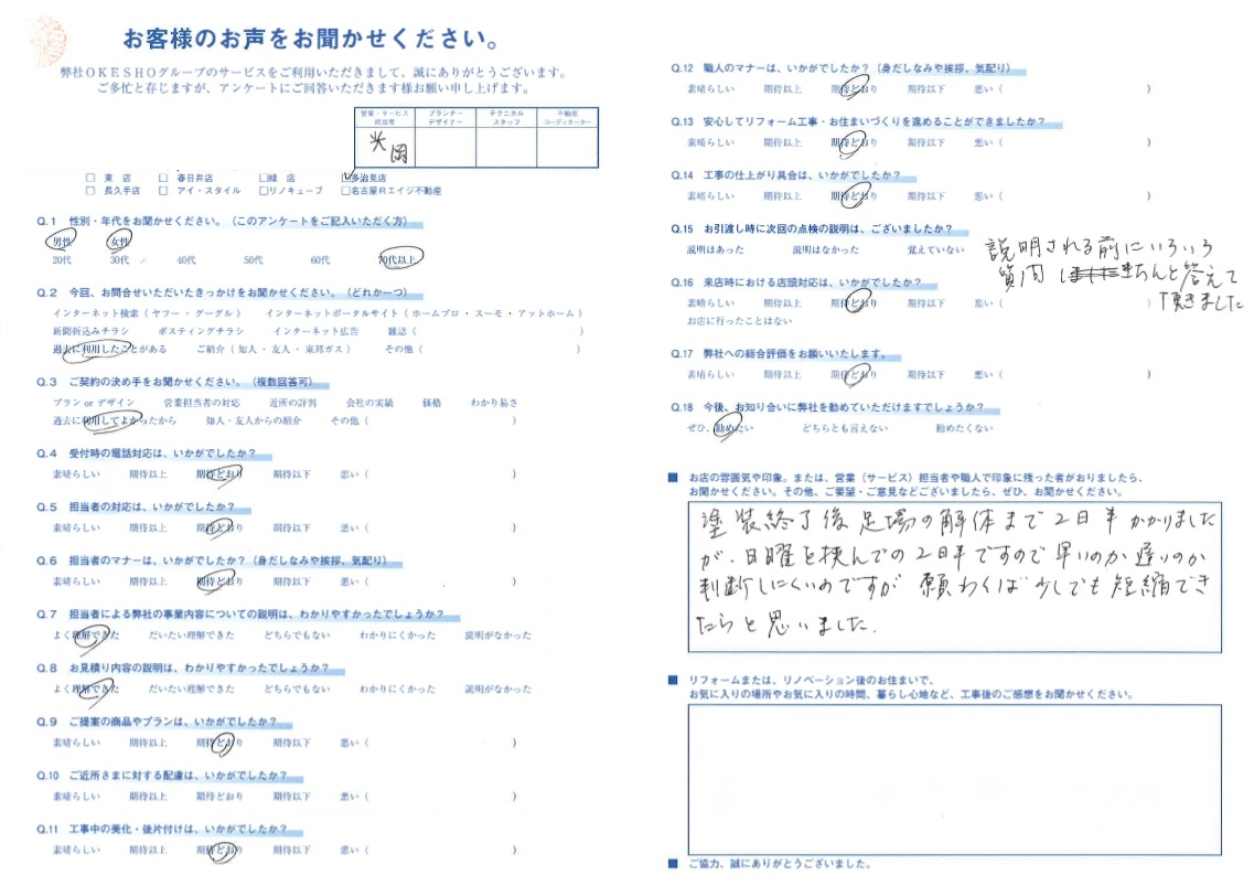 お店の雰囲気や印象。または、営業(サービス)担当者や職人で印象に残った者がおりましたら、お聞かせください。その他、ご要望・ご意見などございましたら、ぜひ、お聞かせください。
