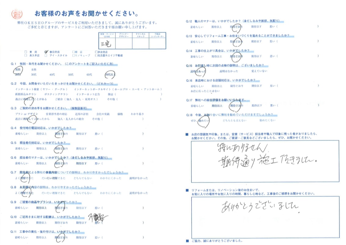 お店の雰囲気や印象。または、営業(サービス)担当者や職人で印象に残った者がおりましたら、お聞かせください。その他、ご要望・ご意見などございましたら、ぜひ、お聞かせください。
