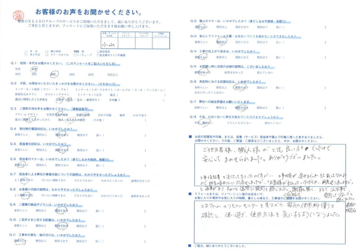 工事保証書を送付して下さったのですが…工事内容が途中までしか記載してなかったので 担当の永田さんに問合せしましたが、「お客様が記入していただくか、再度送り直しますが」と返事があり ちょっと返答に疑問を感じました。ミスに対して謝罪も無く、まるで こんな事で電話してこないでと感じました。最後に残念でした。
