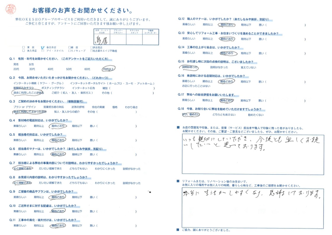 お店の雰囲気や印象。または、営業(サービス)担当者や職人で印象に残った者がおりましたら、お聞かせください。その他、ご要望・ご意見などございましたら、ぜひ、お聞かせください。