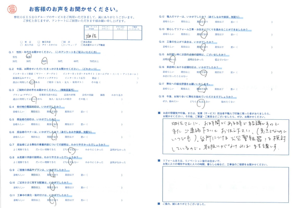 お店の雰囲気や印象。または、営業(サービス)担当者や職人で印象に残った者がおりましたら、お聞かせください。その他、ご要望・ご意見などございましたら、ぜひ、お聞かせください。