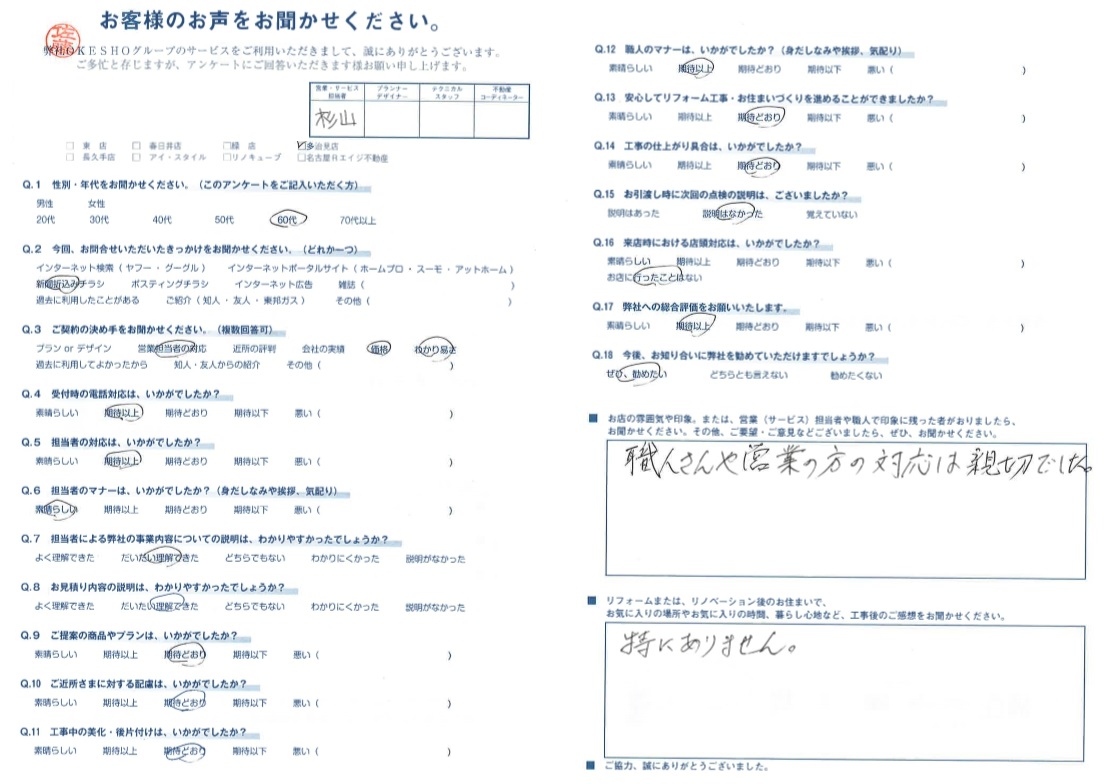 お店の雰囲気や印象。または、営業(サービス)担当者や職人で印象に残った者がおりましたら、お聞かせください。その他、ご要望・ご意見などございましたら、ぜひ、お聞かせください。