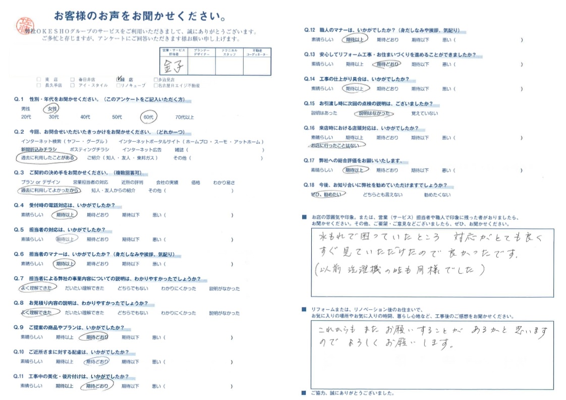 水もれで困っていたところ 対応がとても良くすぐ見ていただけたので良かったです。