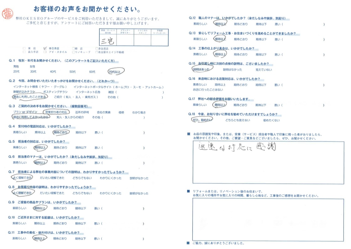 お店の雰囲気や印象。または、営業(サービス)担当者や職人で印象に残った者がおりましたら、お聞かせください。その他、ご要望・ご意見などございましたら、ぜひ、お聞かせください。