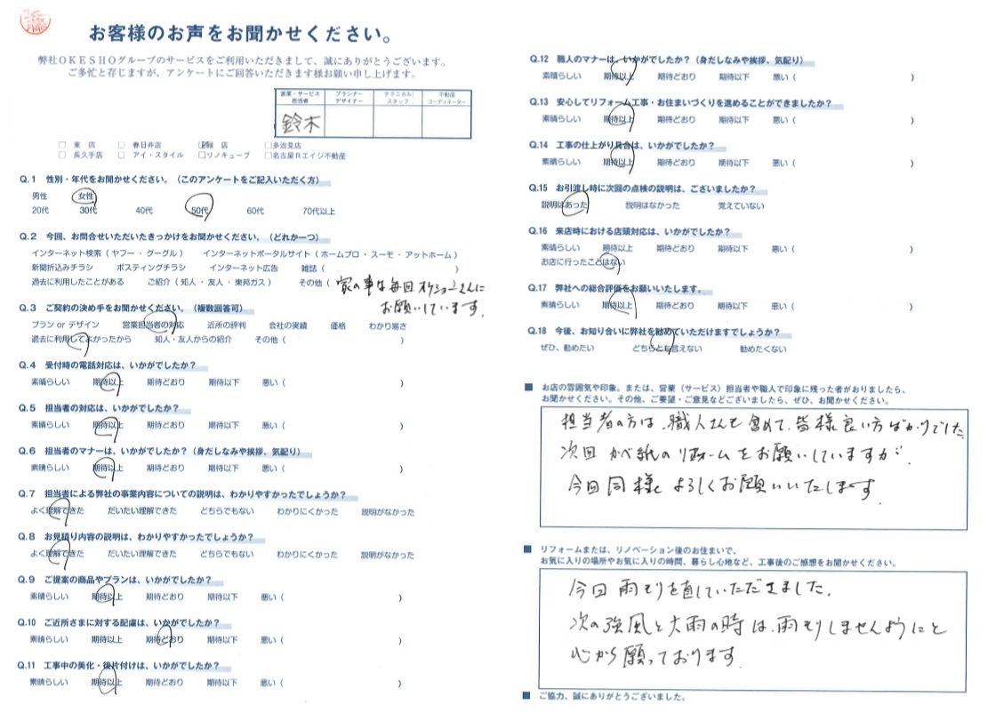 お店の雰囲気や印象。または、営業(サービス)担当者や職人で印象に残った者がおりましたら、お聞かせください。その他、ご要望・ご意見などございましたら、ぜひ、お聞かせください。