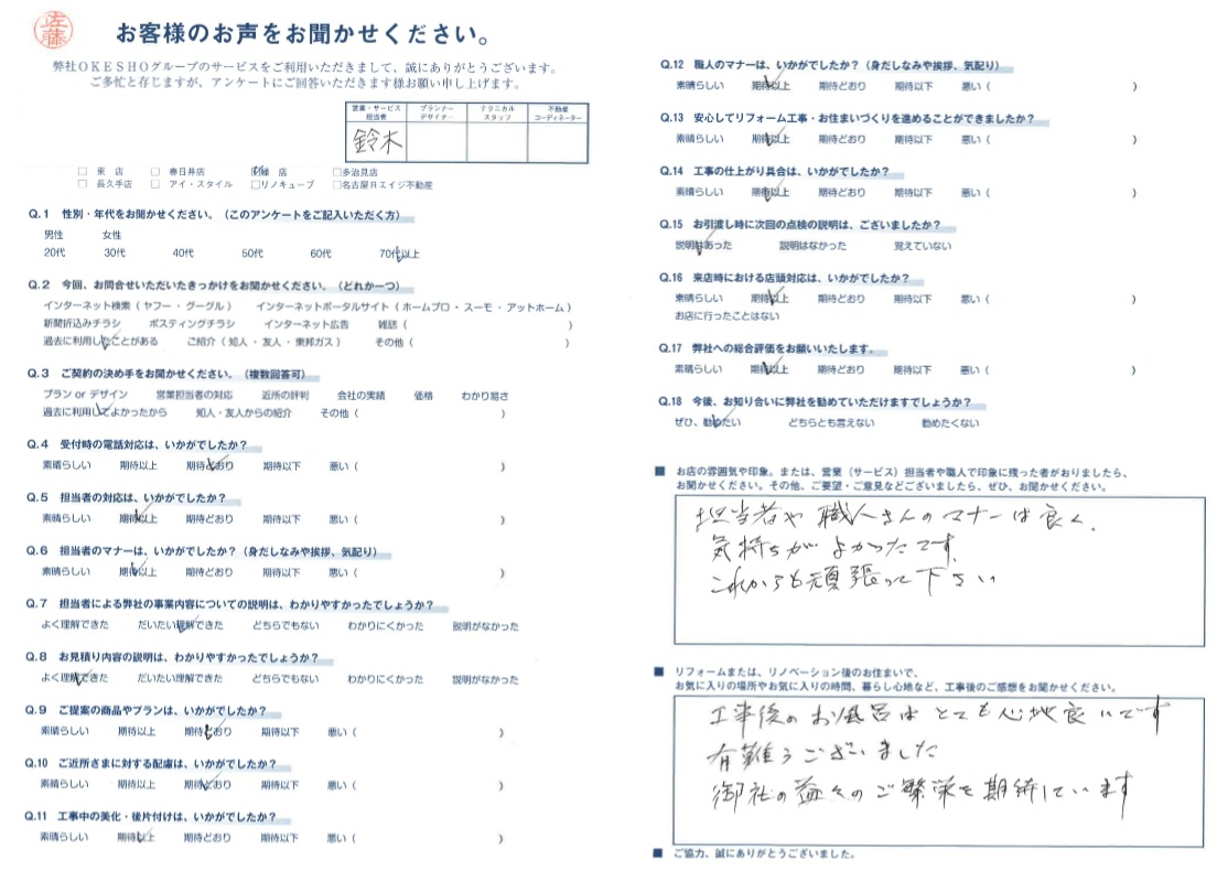 お店の雰囲気や印象。または、営業(サービス)担当者や職人で印象に残った者がおりましたら、お聞かせください。その他、ご要望・ご意見などございましたら、ぜひ、お聞かせください。