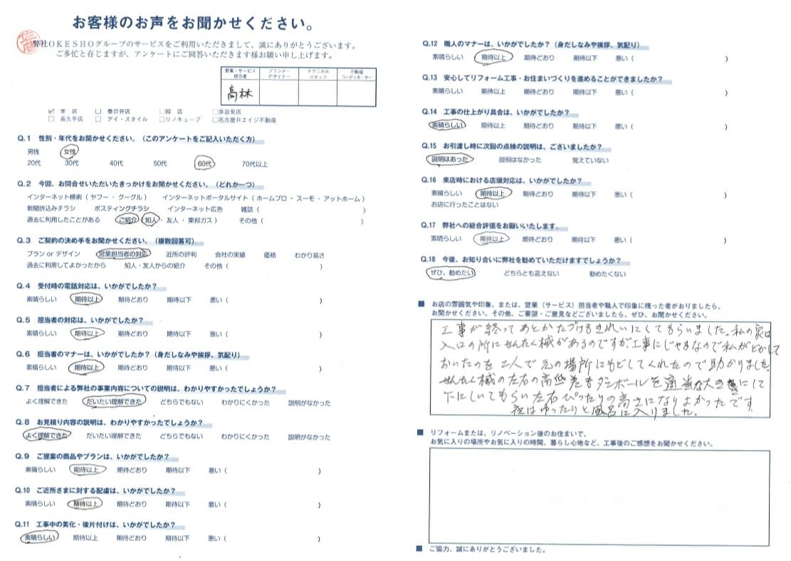 お店の雰囲気や印象。または、営業(サービス)担当者や職人で印象に残った者がおりましたら、お聞かせください。その他、ご要望・ご意見などございましたら、ぜひ、お聞かせください。