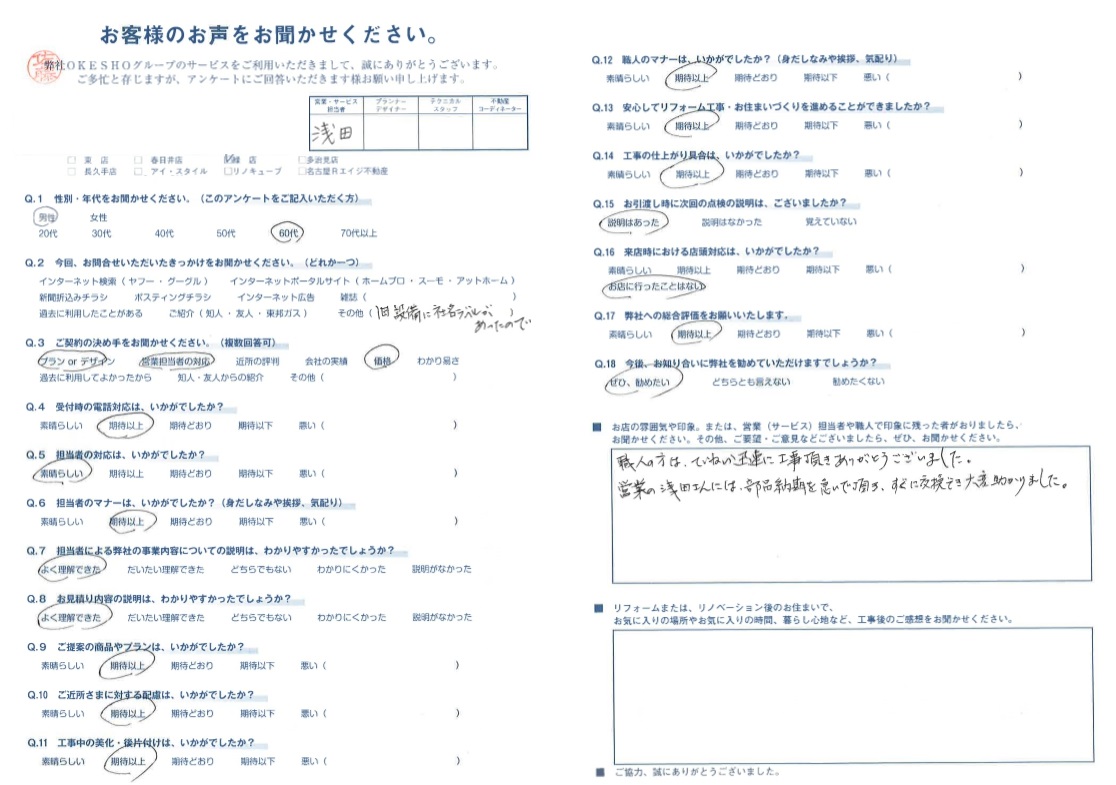 お店の雰囲気や印象。または、営業(サービス)担当者や職人で印象に残った者がおりましたら、お聞かせください。その他、ご要望・ご意見などございましたら、ぜひ、お聞かせください。
