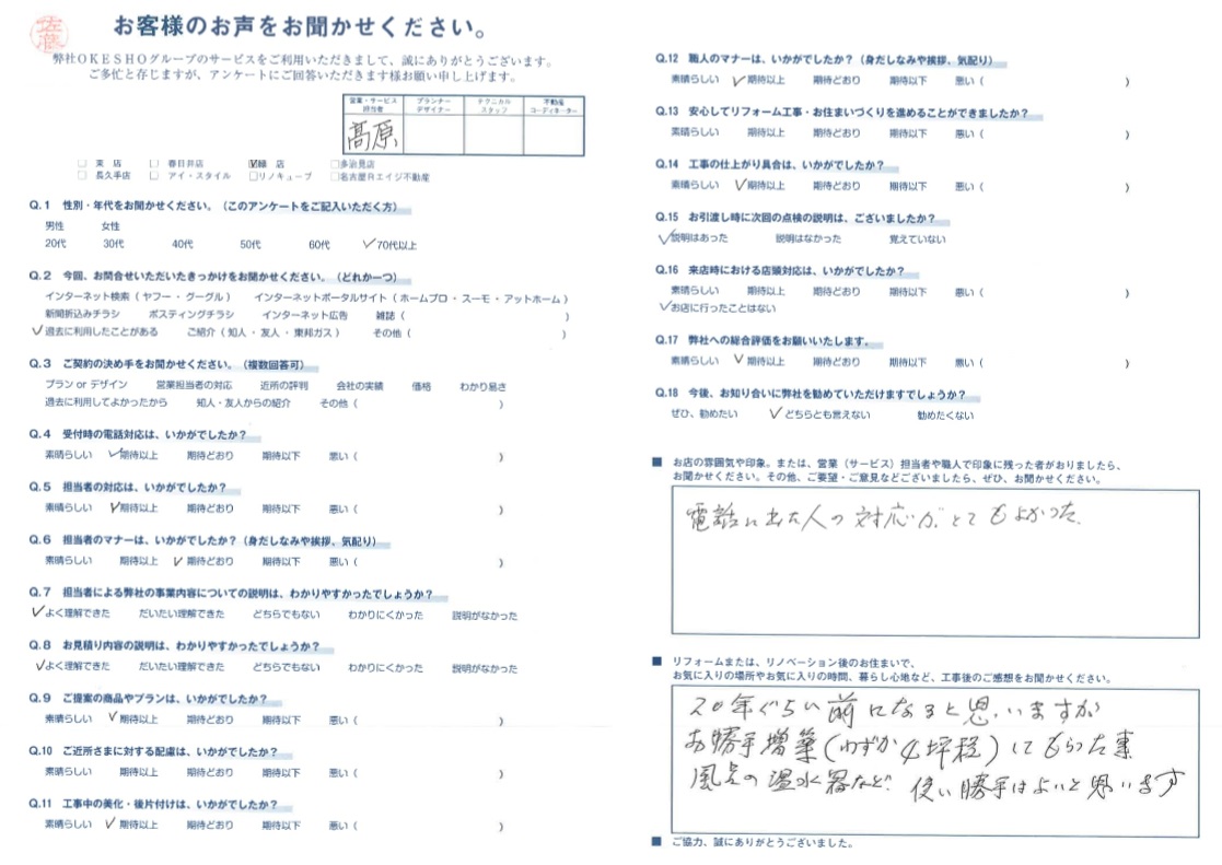 お店の雰囲気や印象。または、営業(サービス)担当者や職人で印象に残った者がおりましたら、お聞かせください。その他、ご要望・ご意見などございましたら、ぜひ、お聞かせください。