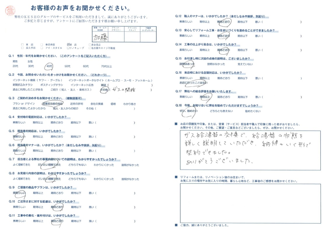 ガス給湯器の交換で、給湯器の状態を詳しく説明していただき納得のいく形で契約できました。
