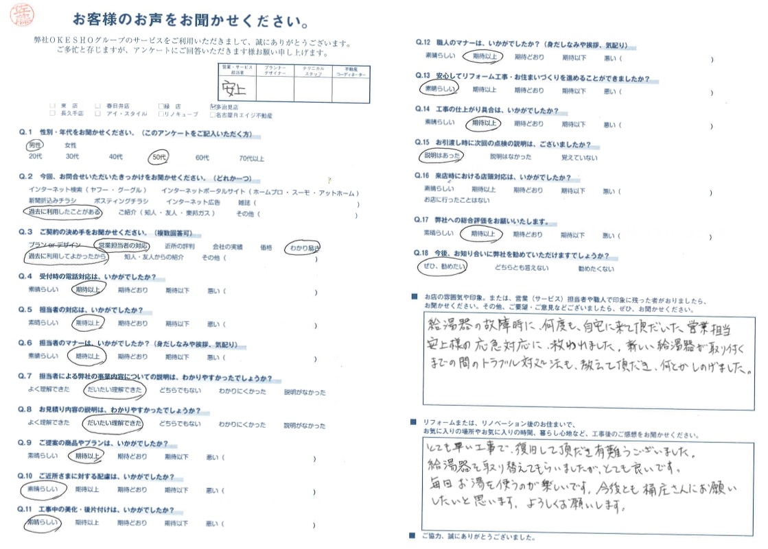 給湯器の故障時に 何度も自宅に来て頂いた営業担当 安上様の応急対応に救われました。新しい給湯器が取り付くまでの間のトラブル対処法も教えて頂き、何とかしのげました。
