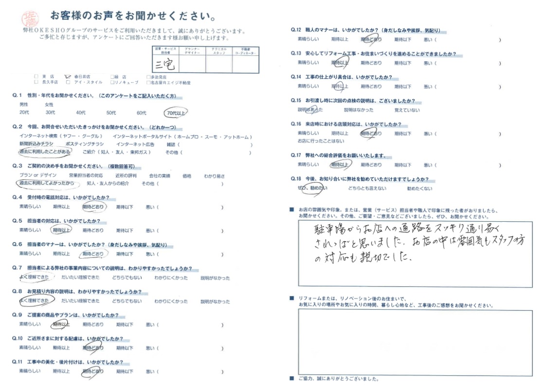 お店の雰囲気や印象。または、営業(サービス)担当者や職人で印象に残った者がおりましたら、お聞かせください。その他、ご要望・ご意見などございましたら、ぜひ、お聞かせください。