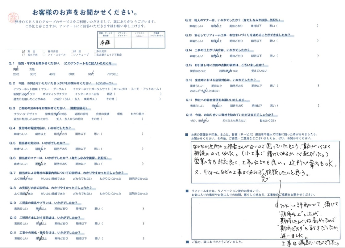 なかなか近所の工務店さんがないので困っていたところ、貴社が心よく相談にのってくれた。(小工事で請けてくれるか心配だった。)営業の方も対応良く、工事の仕上りも良い。近所への案内もOK。